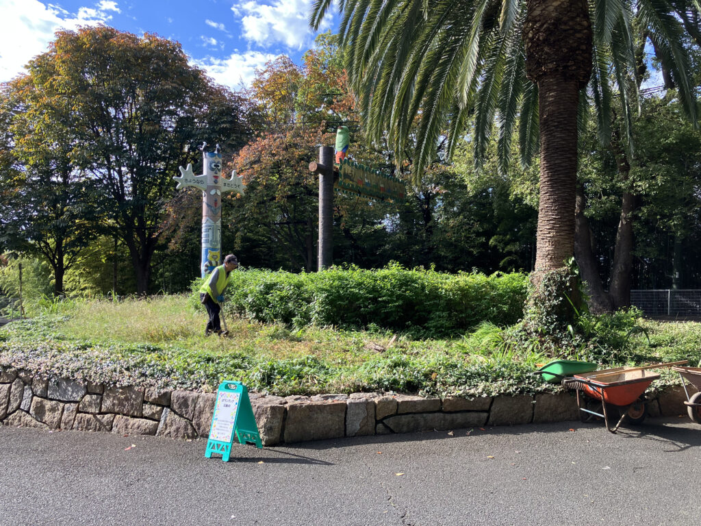 今回の環境保全作業は、夢見ヶ崎動物公園内の園路笹刈り・草刈り、および花壇の手入れなどということで、2グループに分かれ、2か所で作業を行いました。