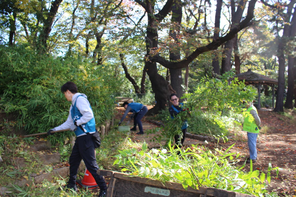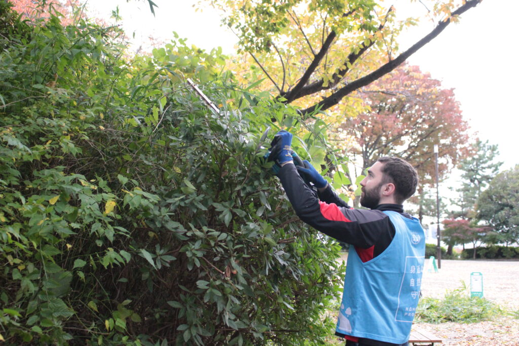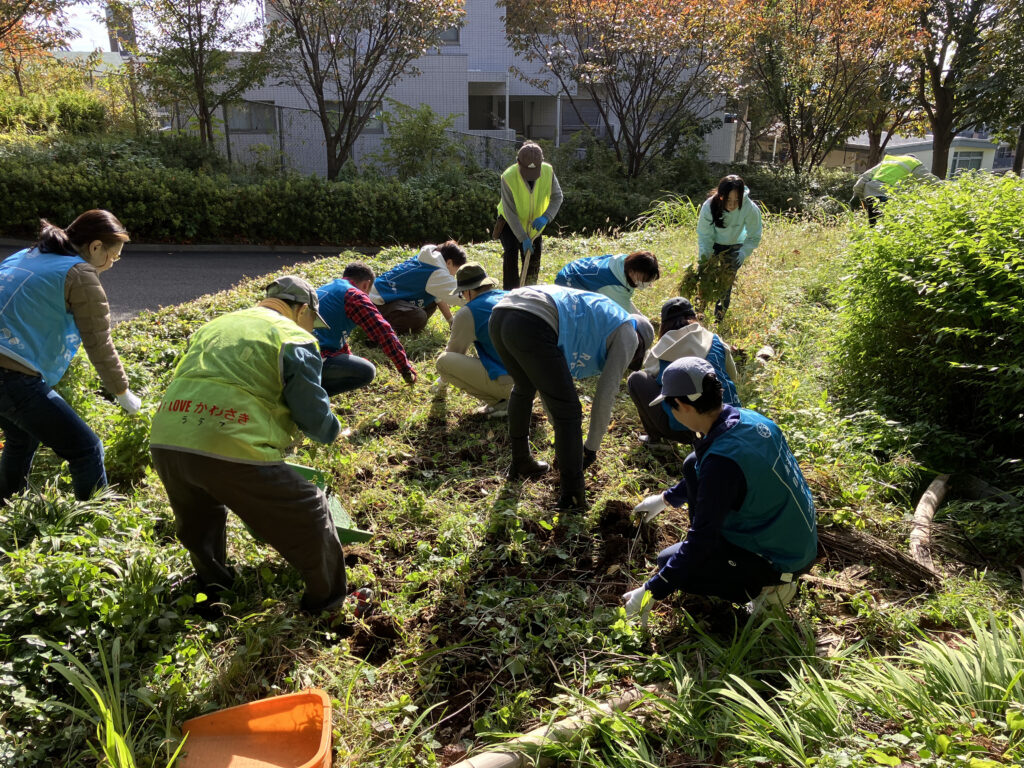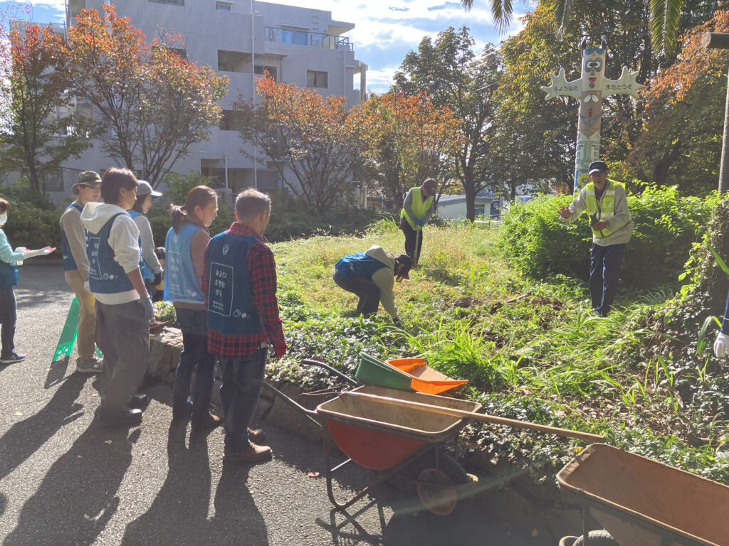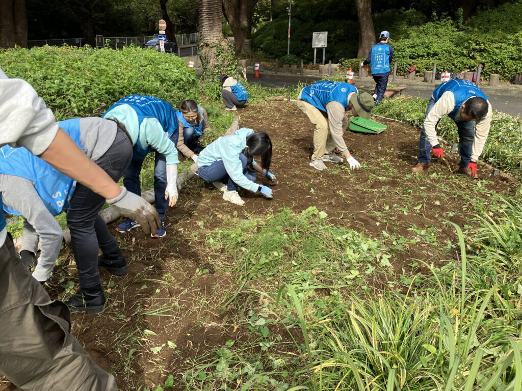 ヤマブキに覆われているツル植物(ヤブガラシなど)を取り除いていきます。みんなで作業するとあっという間に綺麗になりました。この後、現地団体のみなさんが花苗を植えるそうです。来年の春が楽しみです。