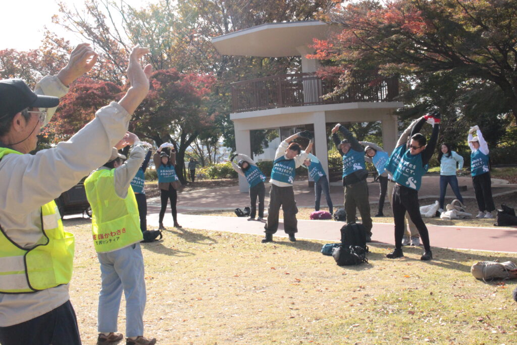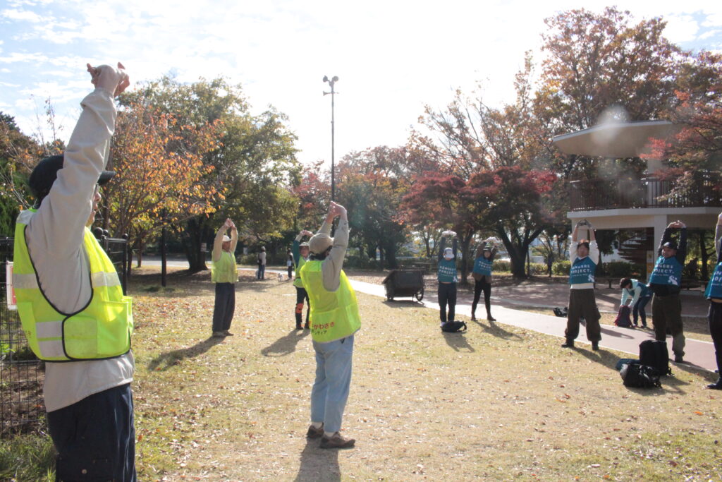 作業場所の近くへ移動し、簡単な体操をおこないました。